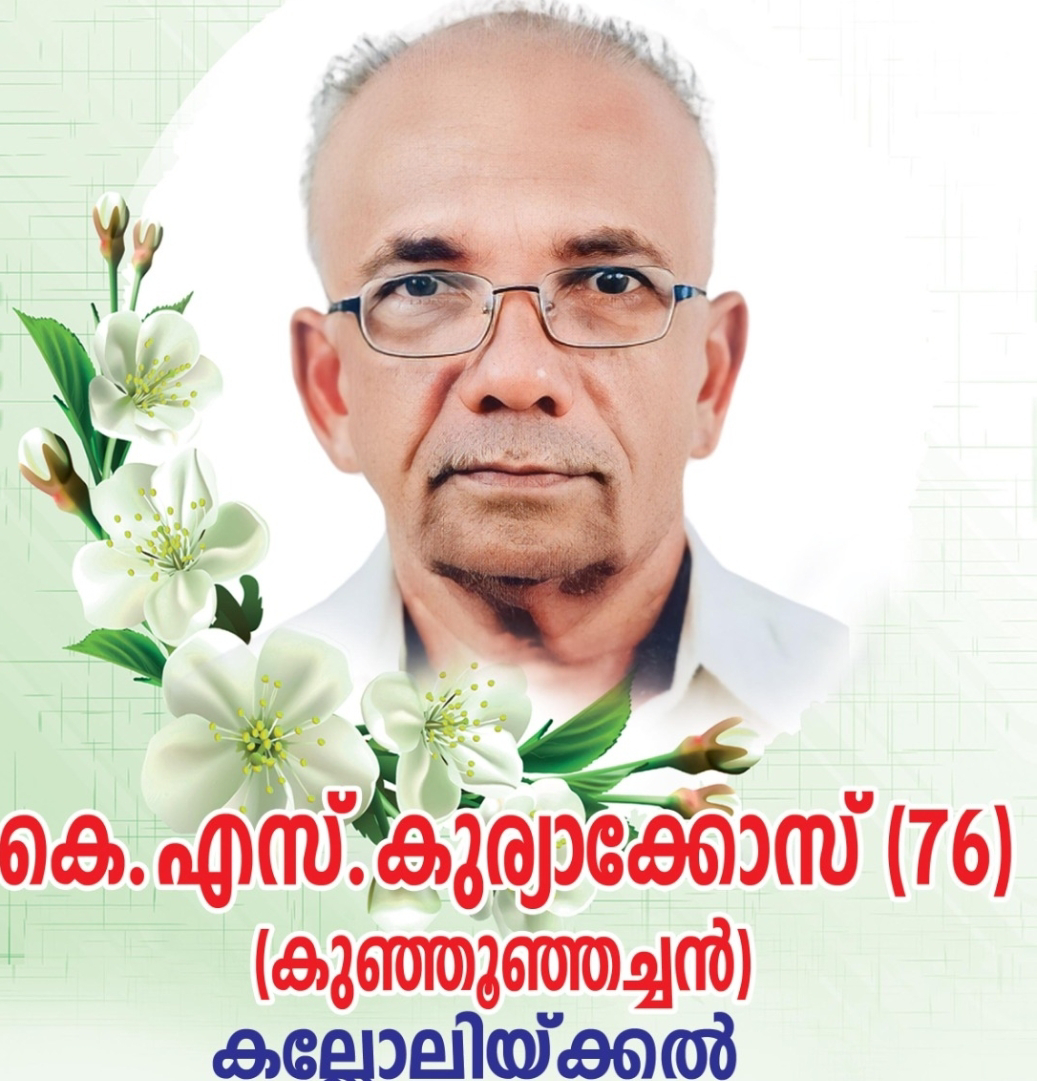 പാമ്പാടി - വെള്ളൂർ : തേമ്പള്ളിൽ കുടുംബാംഗമായ വെള്ളൂർവടക്കേക്കര കല്ലോലിക്കൽ കെ. എസ്സ്  കുര്യാക്കോസ് ( കുഞ്ഞൂഞ്ഞച്ചൻ - 76) അന്തരിച്ചു.  സംസ്കാരം ഇന്ന്(ബുധനാഴ്ച ) 11 ന് വസതിയിൽ ശുശ്രുഷയ്ക്ക് ശേഷം വെള്ളൂർ സെന്റ് സൈമൺസ് യാക്കോബായ സുറിയാനി  പള്ളിയിൽ. ഭാര്യ: എസ്സ് എൻ പുരം തൊട്ടീപ്പറമ്പിൽ പരേതയായ മറിയാമ്മ. മക്കൾ : ബിൻസി, ബിനു. മരുമക്കൾ: ശാന്തിപുരം ചിറവക്കാട്ട് ബിജു, കളത്തിപ്പടി ഞാറക്കൽ പ്രഭ.