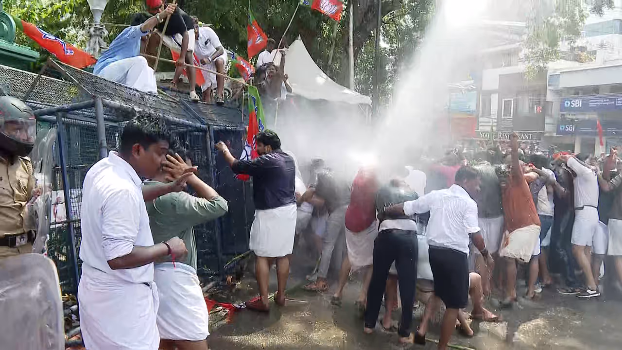 മാർച്ച് ബാരിക്കേഡ് വെച്ച് പൊലീസ് തടയുകയായിരുന്നു. തുടർന്ന് ബാരിക്കേഡിന് മുകളിലേക്ക് കയറി പ്രവർത്തകർ പ്രതിഷേധിച്ചു. പൊലീസ് തുടർന്ന് ജലപീരങ്കി പ്രയോഗിച്ചു. ജലപീരങ്കിക്കുനേരെ കമ്പുകൾ പ്രവർത്തകർ കമ്പുകൾ വലിച്ചെറിഞ്ഞു. പ്രതിഷേധത്തിനിടെ ദേവസ്വം മന്ത്രി വിഎൻ വാസവൻറെ കോലം പ്രവർത്തകർ കത്തിച്ചു. സ്ഥലത്ത് സംഘർഷാവസ്ഥ തുടരുകയാണ്. പ്രവർത്തകർ ബാരിക്കേഡ് മറിച്ചിടാൻ ശ്രമിക്കുകയാണ്. പൊലീസ് വാഹനത്തിനുനേരെയും പ്രവർത്തകർ തിരിഞ്ഞു. രണ്ടു മണിക്കൂറോളമായി സ്ഥലത്ത് സംഘർഷാവസ്ഥ നിലനിൽക്കുകയാണ്. പൊലീസും പ്രവർത്തകരും തമ്മിൽ സംഘർഷം തുടരുകയാണ്. പൊലീസ് പലതവണ ജലപീരങ്കി പ്രയോഗിച്ചെങ്കിലും മുദ്രവാക്യം വിളിച്ച് പ്രവർത്തകർ സ്ഥലത്ത് തുടരുകയാണ്.