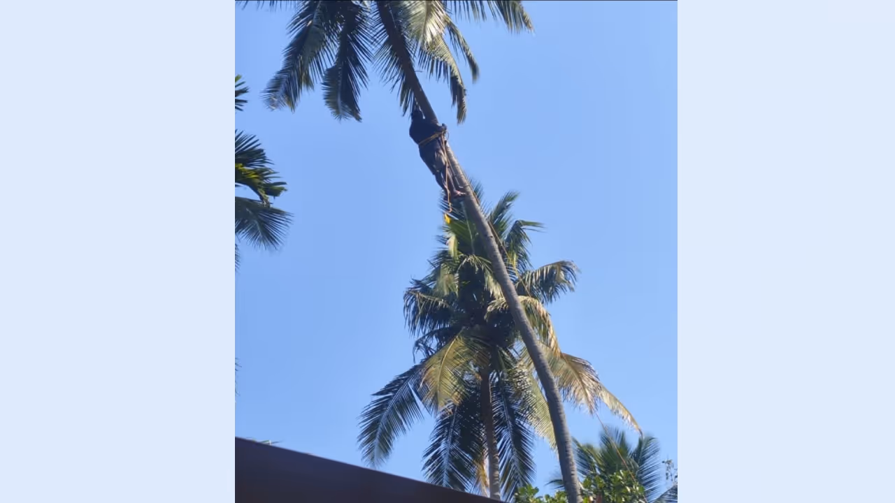 ആടിയുലഞ്ഞ തെങ്ങിന് മുകളിൽ പ്രാണഭയത്തോടെ തൊഴിലാളി കഴിഞ്ഞത് 2 മണിക്കൂർ; അവസാനം ഫയർഫോഴ്‌സ് രക്ഷകരായി