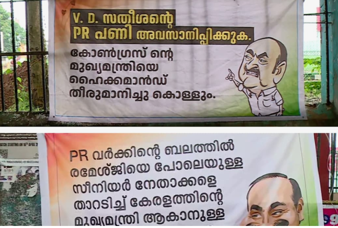 വി ഡി സതീശന്റെ പിആര് പണി അവസാനിപ്പിക്കണമെന്നും കോണ്ഗ്രസ് മുഖ്യമന്ത്രിയെ ഹൈക്കമാന്ഡ് തീരുമാനിക്കുമെന്നും പോസ്റ്ററില് കുറിച്ചിരിക്കുന്നു. കളമശേരി സയന്സ് പാര്ക്കിന് സമീപവും ഫ്ലക്സ് ബോര്ഡ് പ്രത്യക്ഷപ്പെട്ടിരുന്നു